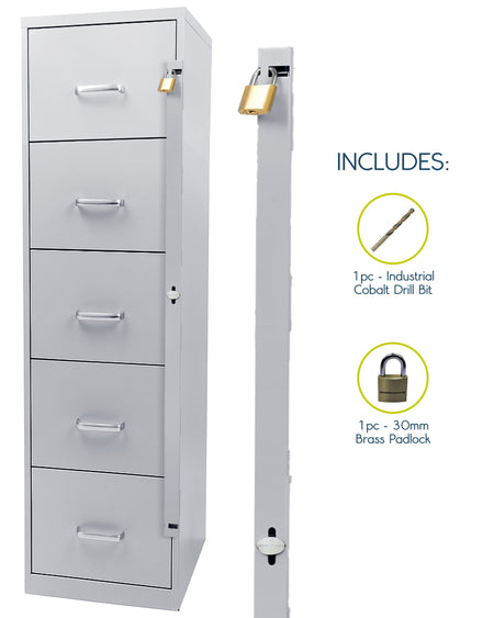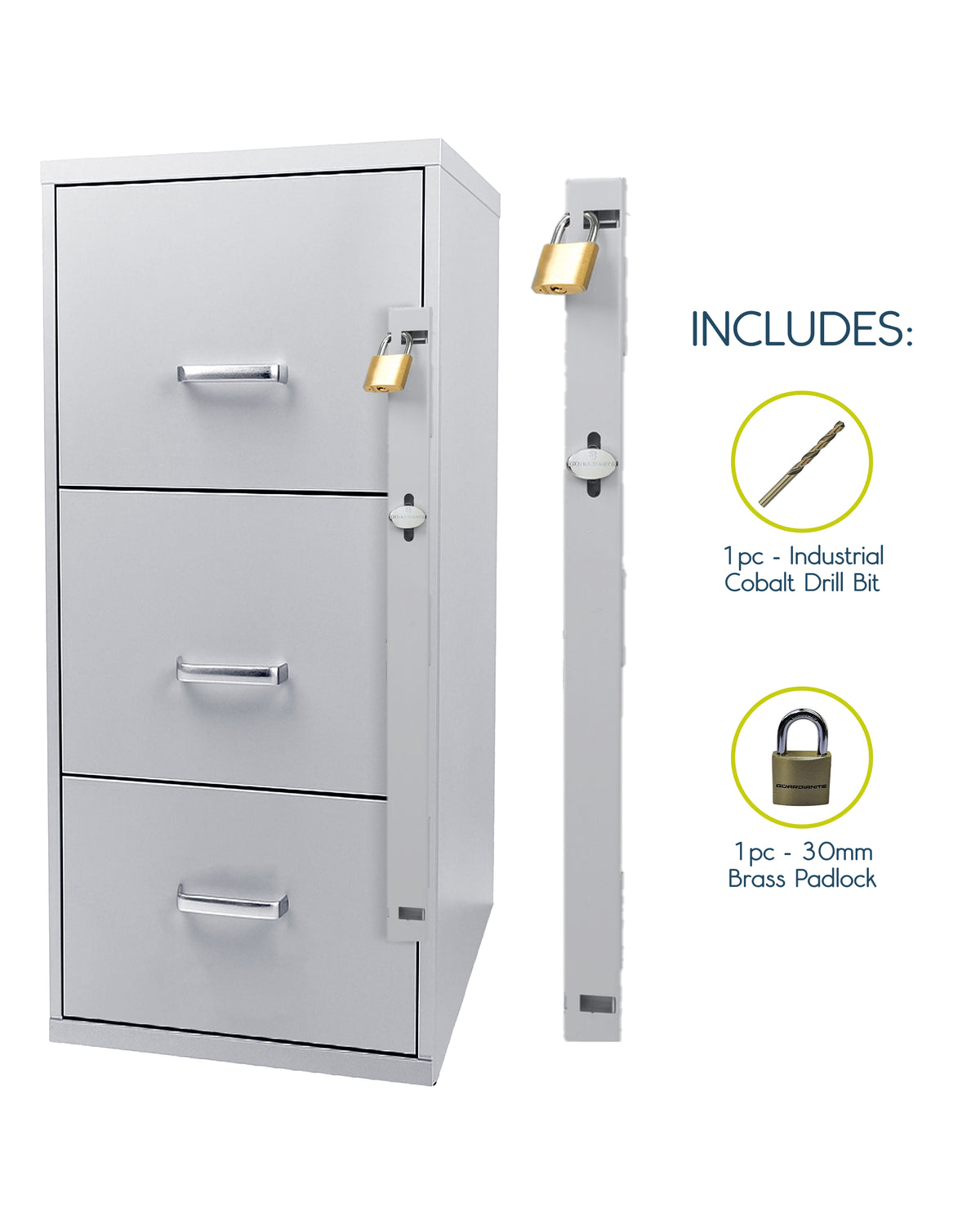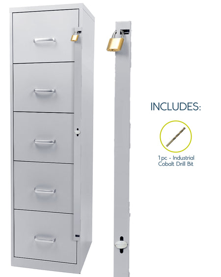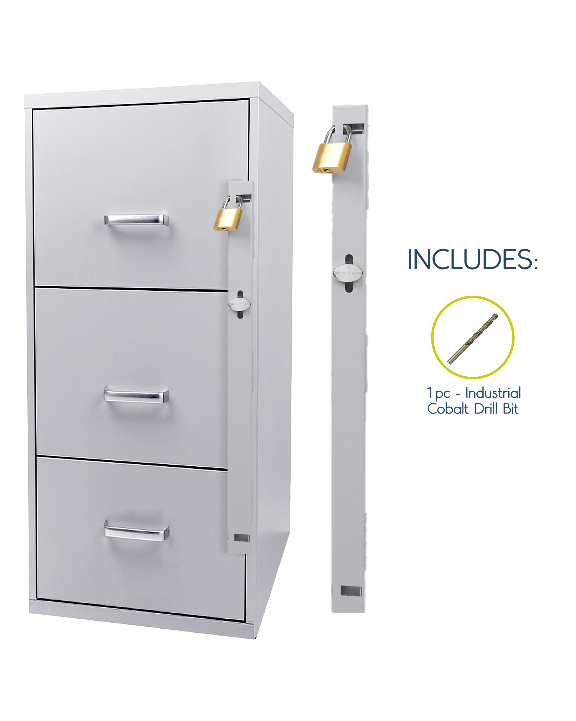 Lock your file cabinet. The simple to use, easy to install bar securely fastens to the frame next to the drawers on the front of your file cabinet (minimum 0.5” frame required).
